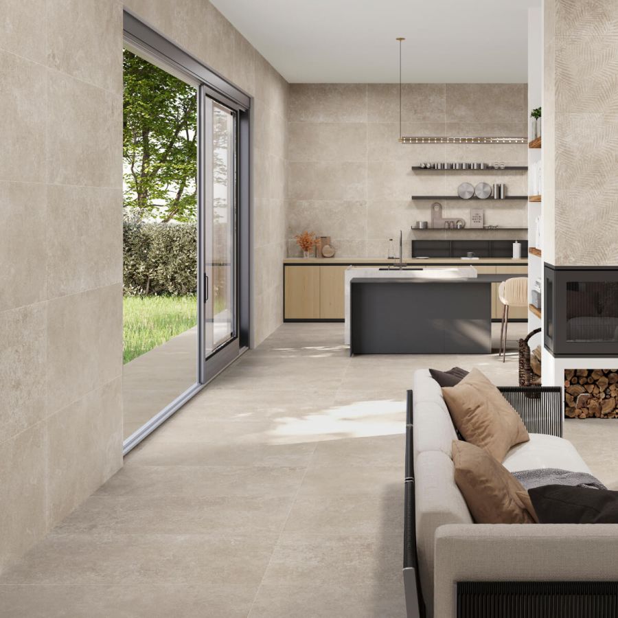 W połączeniu z beżową sofą, szklanym stolikiem i zielenią roślin, Bella Stone Cream tworzy wnętrze spokojne, nowoczesne, ale nigdy zimne. Przestrzeń, w której naprawdę chce się być.