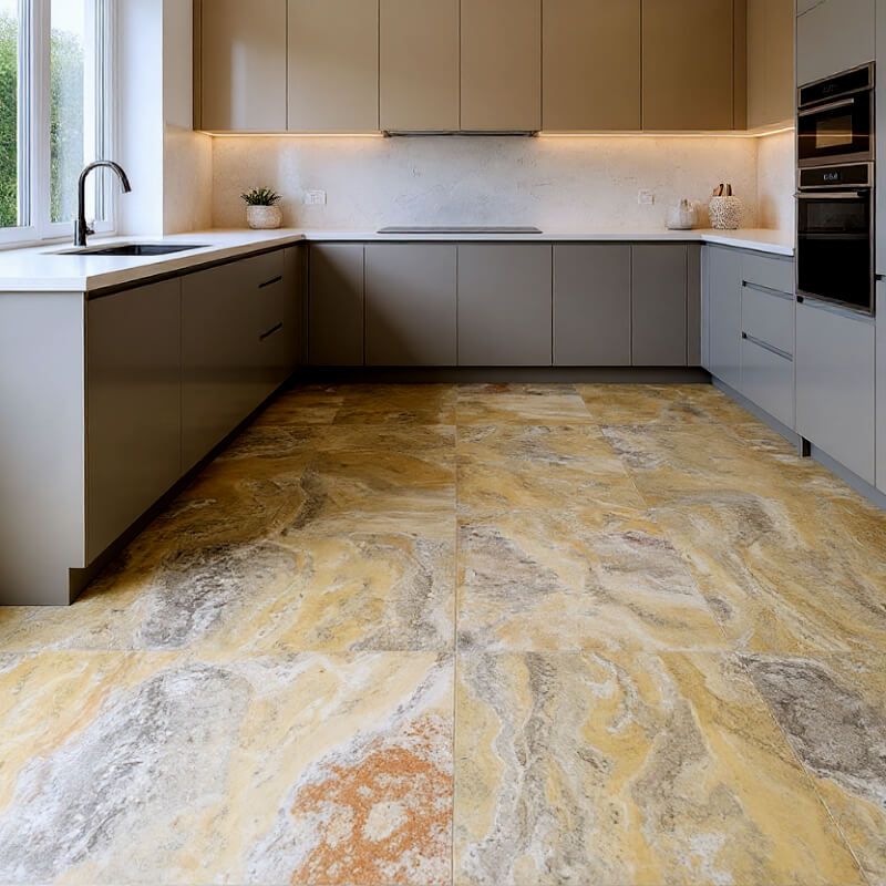 Trawertyn to kamień z historią – był używany już w starożytnym Rzymie, m.in. do budowy Koloseum. Wersja Scabos wyróżnia się nie tylko intensywną kolorystyką, ale również unikatową strukturą, która maskuje drobne zabrudzenia i uszkodzenia, dzięki czemu płytki są praktyczne w codziennym użytkowaniu.
