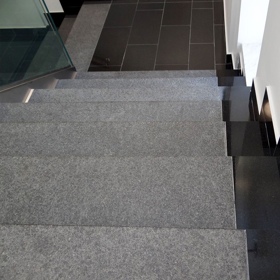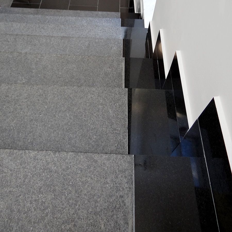 Stopień granitowy G684 Black Pearl płomieniowany 150x33x3 cm to solidny element schodowy wykonany z naturalnego granitu o grafitowo-czarnej barwie z delikatnym, drobnoziarnistym rysunkiem. Wykończenie płomieniowane nadaje powierzchni chropowatą, antypoślizgową strukturę, zwiększając bezpieczeństwo użytkowania – szczególnie w warunkach zewnętrznych i przy podwyższonej wilgotności.